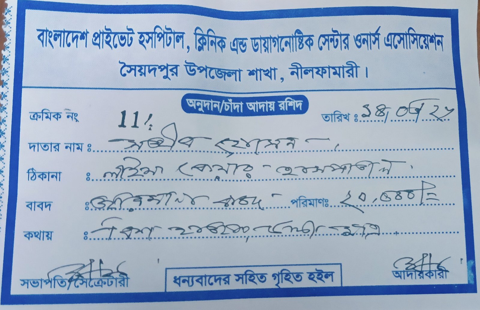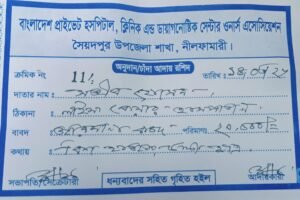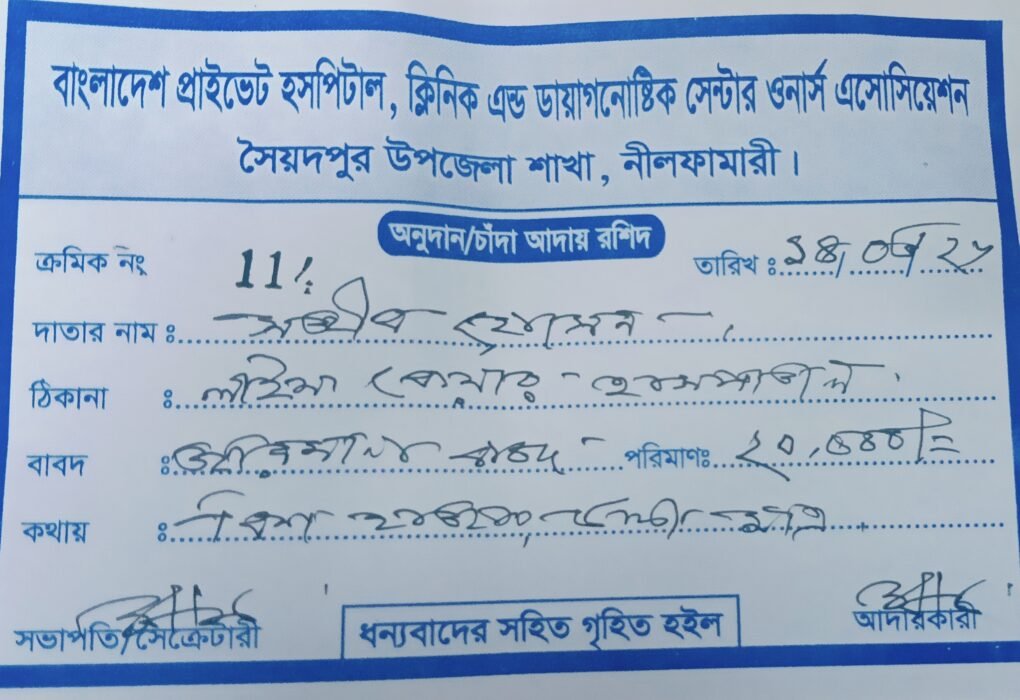 নিজস্ব প্রতিবেদক: নীলফামারী: নীলফামারীর সৈয়দপুরে সরকারি বিধি লঙ্ঘন করে ‘বাংলাদেশ প্রাইভেট হাসপাতাল, ক্লিনিক এন্ড ডায়াগনস্টিক সেন্টার ওনার্স এসোসিয়েশন’-এর নামে অবৈধভাবে জরিমানা আদায়ের অভিযোগ উঠেছে। এ বিষয়ে তীব্র প্রতিক্রিয়া ব্যক্ত করেছেন জেলা সিভিল সার্জন ডা. মো. আব্দুর রাজ্জাক। তিনি সাফ জানিয়ে দিয়েছেন, কোনো বেসরকারি সংগঠনের এভাবে জরিমানা করার কোনো আইনি বিধান নেই এবং তিনি কাউকে এমন…
